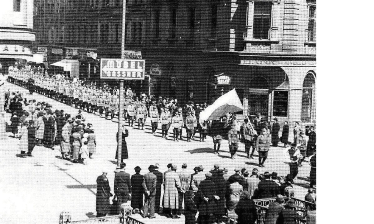 Demonstration in Eger/Cheb am 1. Mai 1938: Einheiten der Republikanischen Wehr unter der tschechoslowakischen Fahne.