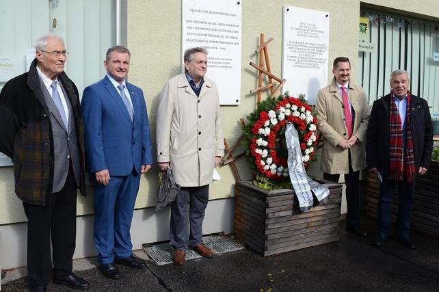 Text: u.a.: Sudetendeutscher Pressedienst (SdP) Österreich Kranzniederlegung in der Seliger-Siedlung bei der Gedenktafel: v.l. LAbg. aD. Gerhard Zeihsel, Bundesobmann der Sudetendeutschen Landsmannschaft in Österreich (SLÖ), VLÖ-Präsident Ing. Norbert K. Kapeller, Ulrich Miksch, Bundesvorstandsmitglied der Seliger-Gemeinde Deutschland SG, Marcus Franz, Bezirksvorsteher von Wien-Favoriten (SPÖ) und LAbg. aD. Volkmar Harwanegg, dem Vorsitzenden der SGÖ. - Fotos: G. Dwornikowitsch