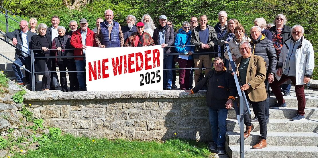 NIE WIEDER – das Bekenntnis der Seliger-Gemeinde zu 80 Jahre Kriegsendes. Am Abgang zum „Tal des Todes“ wo die Gedenktafel der Seliger-Gemeinde für die Sudetendeutschen Sozialdemokraten 2009 angebracht wurde, gedachten die Teilnehmer des Frühjahrsseminar den Opfern. Vor fast genau 80 Jahren, am 23.04.1945 wurde das Konzentrationslager Flossenbürg und die Überlebenden von US-amerikanischen Truppen befreit.