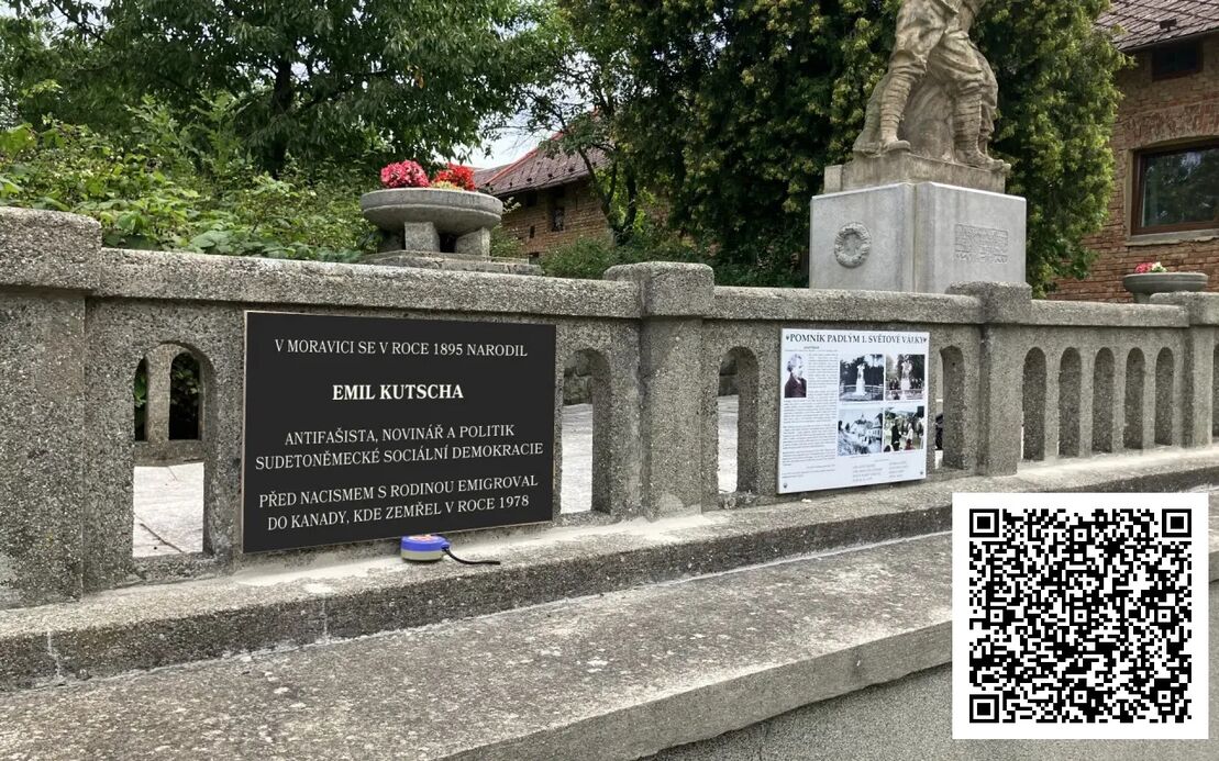 Text der Gedenktafel: EMIL KUTSCHA wurde 1895 in Moravice geboren. Er war Antifaschist, Journalist und Politiker der sudetendeutschen Sozialdemokratie. Vor dem Aufstieg des Nationalsozialismus emigrierte er mit Familie nach Kanada, wo er 1978 starb.