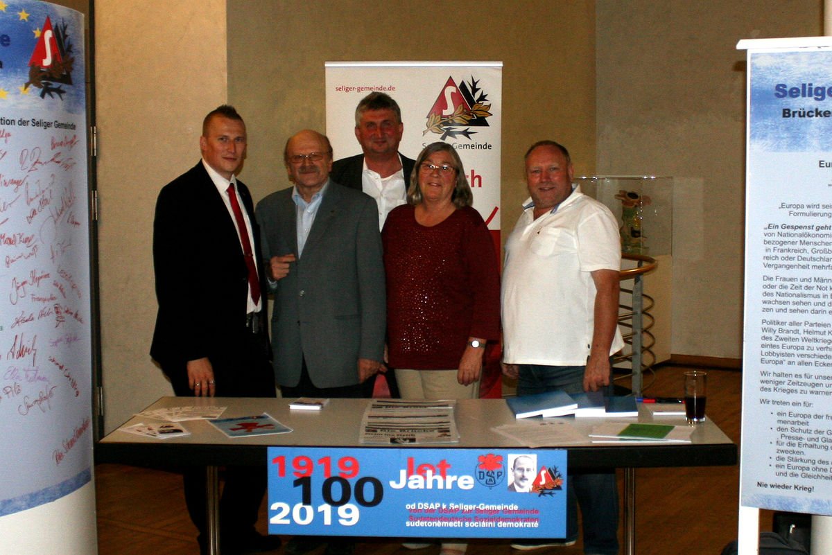Präsentierten die Seliger Gemeinde in der Max-Reger-Halle in Weiden: (v.li.) stellv. Vorsitzender der Regionalgruppe Niederbayern/Oberpfalz Bruno Dengel, Landesvorsitzender Peter Heidler, die Vorstandsmitglieder Herbert Schmid, Renate Heidler und Rainer Pasta