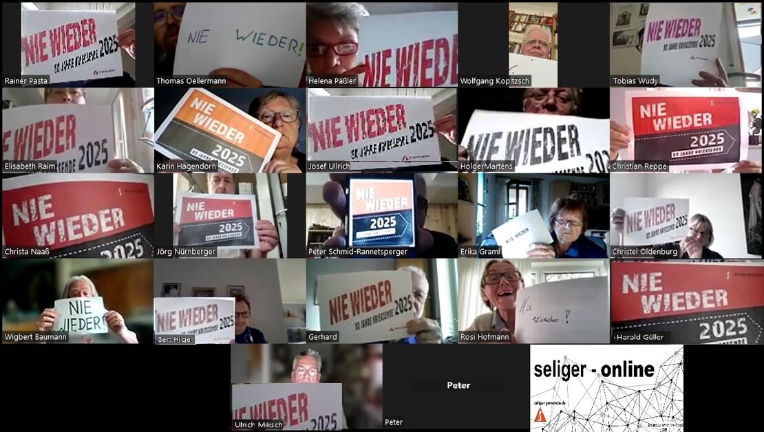 Diesen Beiträgen folgte eine Gedenkminute, bei der weitere Namen verfolgter deutscher und sudetendeutscher Sozialdemokratinnen und Sozialdemokraten eingeblendet wurden. Schließlich rief Thomas Oellermann zu einer gemeinsamen virtuellen Kundgebung zum Abschluss der Veranstaltung auf. Die Teilnehmer hielten Plakate mit der Aufschrift „Nie wieder“ in die Kamera. So endete die erste virtuelle Gedenkveranstaltung der Seliger-Gemeinde mit dem Arbeitskreis ehemals verfolgter und inhaftierter Sozialdemokraten (AvS) zu 80 Jahre Kriegsende mit einem deutlichen Signal.