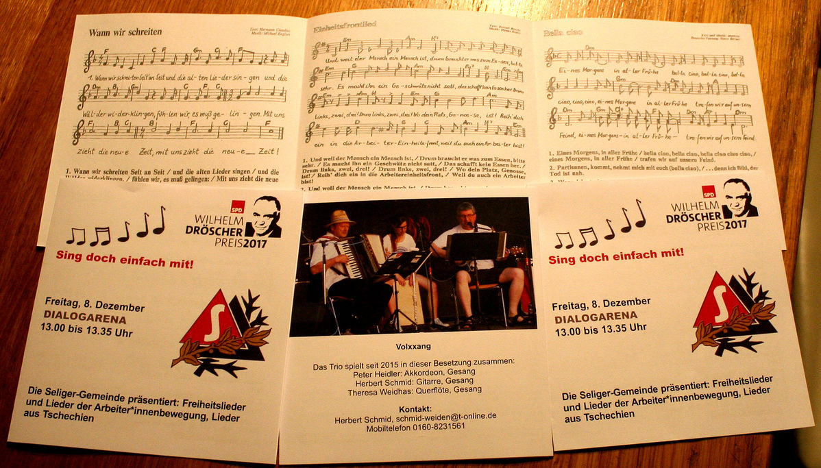 Die Gruppe Voixxang mit unserem Landesvorsitzenden Peter Heidler, Herbert Schmid und Theresa Weidhas unterstützt uns in Berlin bei der Bewerbung um den Wilhelm-Dröscher-Preis. Unser Bühnenprogramm - Arbeiter und Freiheitslieder - läuft am Freitag, den 8. Dezember von 13.00 bis 13.35 Uhr in der DIALOGARENA bei den Ausstellungsständen - kommt vorbei und singt doch einfach mit!