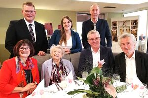 Der neue Vorsitzende der SPD-Landtagsfraktion Holger Grießhammer (2. Reihe li.) sowie die Vorsitzende der BayernSPD Ronja Endres (2. Reihe Mitte) ließen es sich nicht nehmen, zusammen mit der Ko-Vorsitzenden Christa Naaß (vorne li.) und dem ehemaligen Bundesvorsitzenden Dr. Peter Becher (2. Reihe re.) zu gratulieren. Mit dabei Gregor (vorne 2.v.re.) Schneider, Olgas ehemaliger Ortsvereinsvorsitzender und Dr. Friedrich Weckerlein (vorne re.), Jurymitglied zur Verleihung des Wenzel-Jaksch-Gedächtnispreises. „Wir hoffen“, so Christa Naaß, „dass Du uns noch viele Jahre mit Deinen Gedanken, Erinnerungen und Erfahrungen begleiten kannst.“