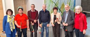 Neben der Ehrung der Mitglieder-Jubilare werden bei der Bundesversammlung der Seliger-Gemeinde, so auch am 28.9.2024, die runden Geburtstage erwähnt. Die Bundesvorsitzenden Christa Naaß (li.) und Helena Päßler (re.) gratulierten: Max Wiltschka (2.v.li.), Lutz Tittel (3.v.li.), Wolfgang Frahne (Mitte), Zita Schmidt (3.v.re.) und Walter Annuß (2.v.re.)