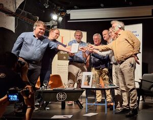 Stießen auf das gelungene Buch-Projekt an: v.l. Patrik Eichler (MdA), Thomas Oellerman (FES), Tomáš Tichák (Verlag Burian und Tichák), Harry Hofbauer, Matthias Dornhuber (BayernSPD), Robert und Peter Hofbauer.