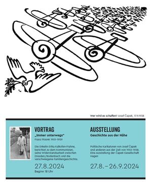 Zur Eröffnung der Ausstellung "Geschichte aus der Nähe" der Hagener Čapek-Gesellschaft am 27. August ist die Geschichte des Widerstandskämpfers Franz Frank (1901–1959) zu hören. Unser Mitglied Erika Kalkofen-Frahne berichtet über ihren Großvater, seine Widerstandsarbeit zwischen Dresden und Bodenbach und die verschwiegene Familiengeschichte. Sie bietet außerdem an, ihr umfangreiches Wissen über Personen und Ereignisse im Grenzgebiet Teilnehmenden des Vortrags zur Verfügung zu stellen.