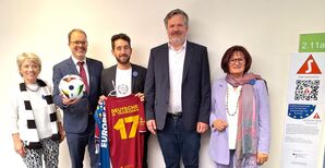 ifa-Kulturmanager Ilyas Zivana (Mitte) präsentiert das Trikot der Mannschaft der deutschen Minderheit der Tschechischen Republik und den Turnierschal der Europeada - mit dabei die Bundesvorsitzenden Christa Naaß (re.) und Helena Päßler (li.) sowie die Fußballexperten Dr. Filip Blaha (2.v.re.) und Markus Rinderspacher (2.v.li.), Vizepräsident des Bayerischen Landtags