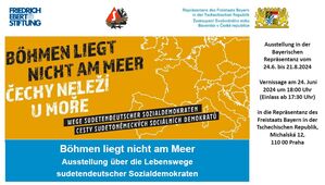 Die zweisprachige Ausstellung „Böhmen liegt nicht am Meer – Lebenswege sudetendeutscher Sozialdemokraten“ beschreibt eine spannende Reise durch die Geschichte der sudetendeutschen Sozialdemokraten bis hin zur heutigen Seliger-Gemeinde. Zur Eröffnung begrüßen wir den ehem. Premier und EU-Kommissar Vladimír Špidla. Die Veranstaltung wird simultan verdolmetscht.