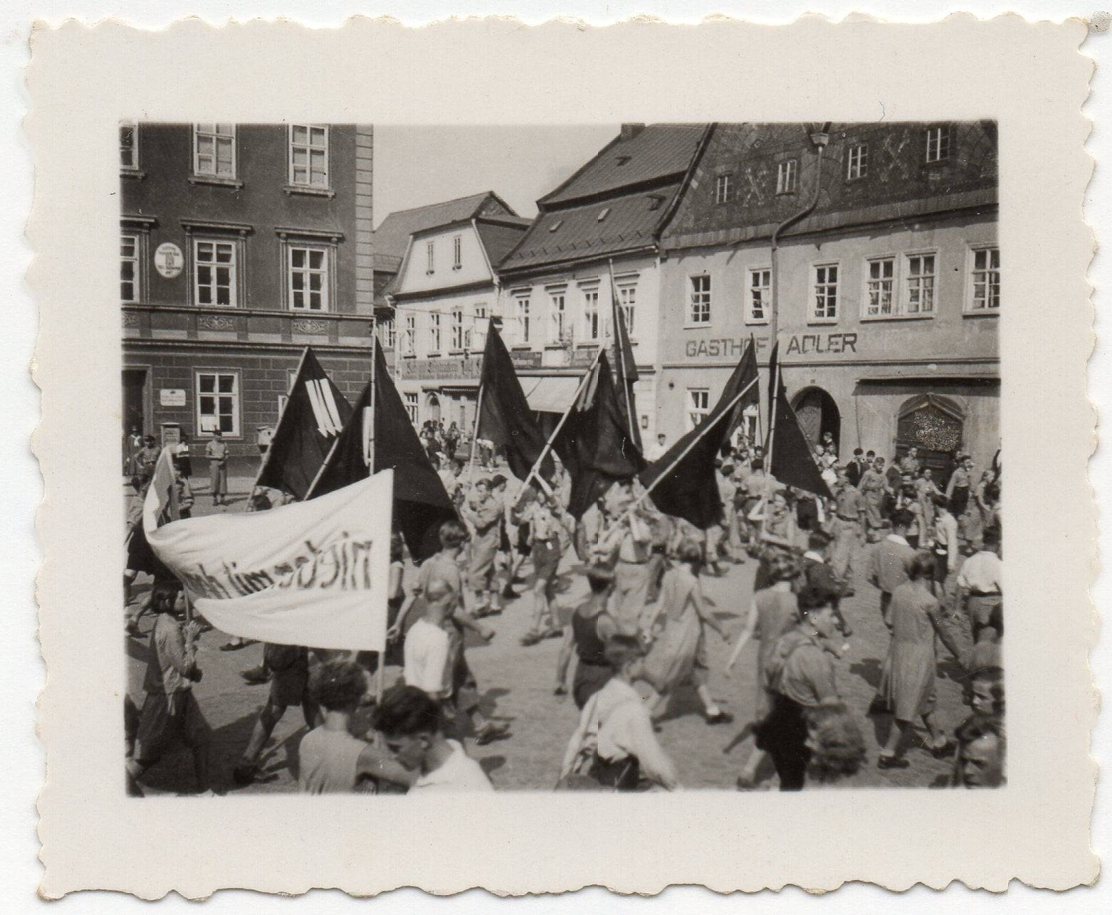 Schnell stellte die Gruppe fest, dass es sich um die Jugendorganisation der DSAP, also die sozialistische Jugendorganisation der sudetendeutschen Sozialdemokratie handelt. Die drei Pfeile auf den (roten) Fahnen und die Uniformen sprachen dafür. Auf dem zweiten Bild sind auch zwei Mitglieder der Arbeiter-Samariter, die wohl die medizinische Betreuung übernommen hatten, zu sehen. Sie sind erkennbar an den weißen Armbinden mit dem weißen Kreuz auf schwarzem Grund. Außerdem zeigt das Bild eine Gruppe von Musikern, die den Zug begleiteten.