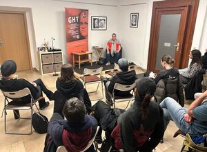 Mit dabei war eine Pfadfindergruppe mit jungen Erwachsenen aus Mecklenburg-Vorpommern. Erika Kalkofen-Frahne hatte rege und sehr interessierte Nachfragen, auch allgemein zum Geschehen im Sudetengau/ Böhmen und "was ist die Seliger-Gemeinde?".